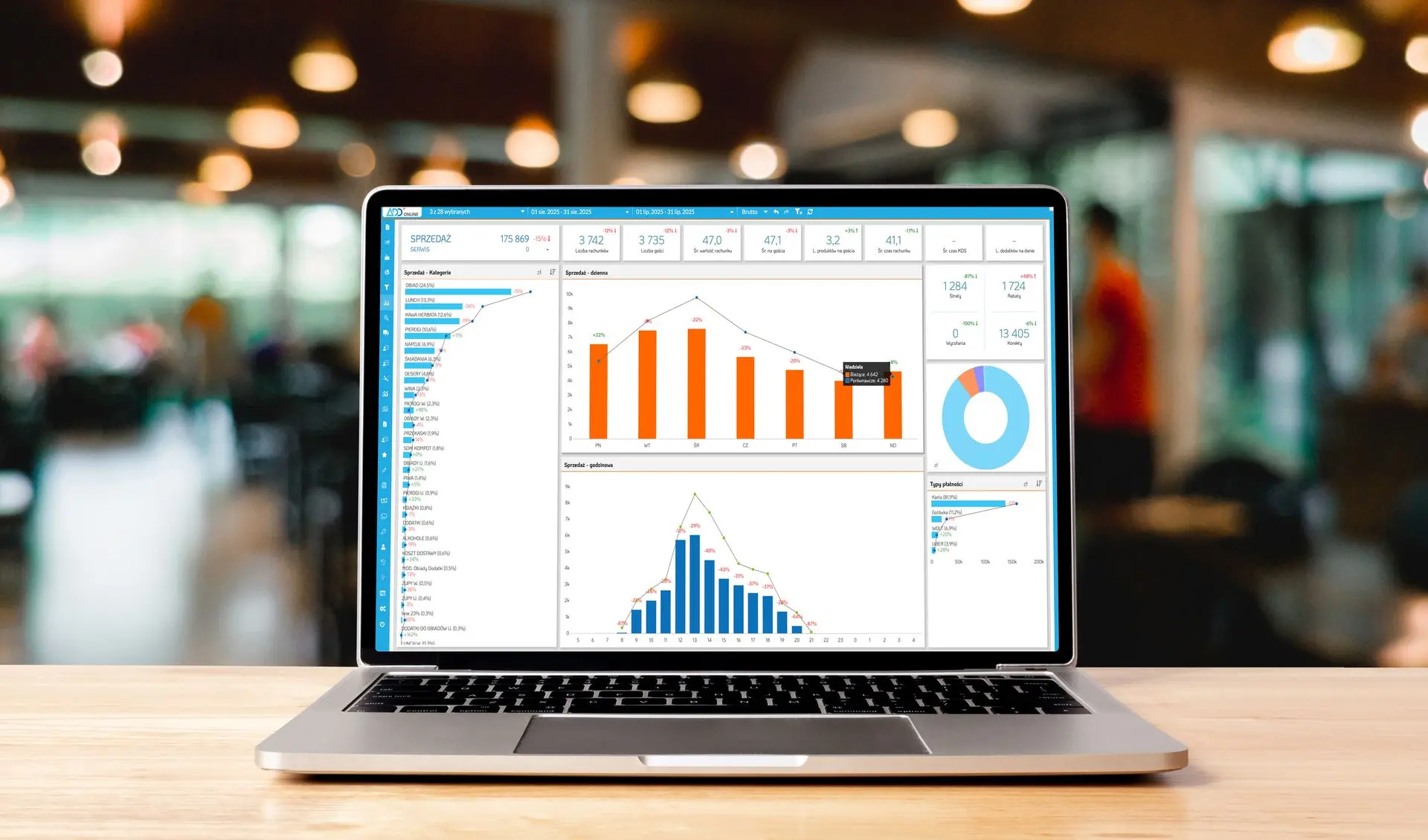 - Możesz analizować szczegóły sprzedaży na miejscu, na wynos i w dostawie.